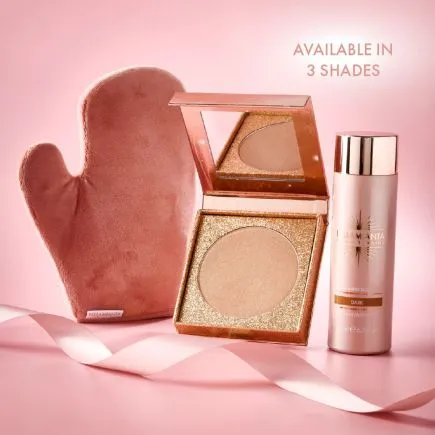 Achieve a flawless, radiant, dark golden tan with the Bellamianta Bow Tied Glow Liquid Gold Tanning Gift Set. This premium 3-piece collection includes the iconic Liquid Gold Tanning Liquid, a luxury double-sided velvet tanning mitt and an illuminating bronzing powder for the ultimate Bella glow.