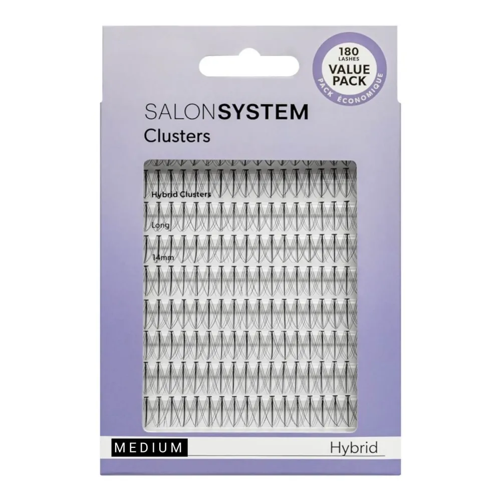 Salon System Hybrid Cluster Lashes Value Pack # Medium blends soft, natural-looking fibres with a wispy wet-look texture to create fuller, beautifully defined lashes. These lightweight clusters are designed to blend seamlessly with natural lashes, making them ideal for creating enhanced yet natural lash styles.
