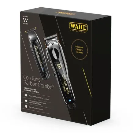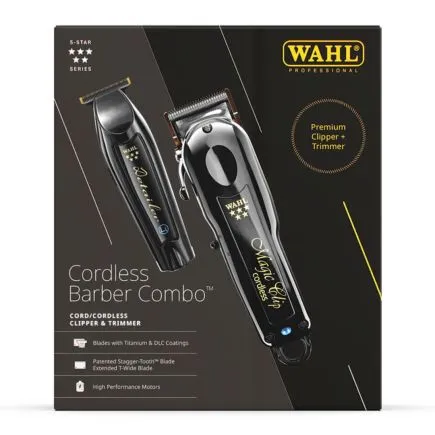 Upgrade your toolkit with the Wahl Cordless Barber Combo, combining the power of the 5-Star Cordless Magic Clip® and Cordless Detailer® Li. Featuring advanced titanium and DLC-coated blades, these tools stay cooler and sharper four times longer, ensuring precise, professional results with every use.