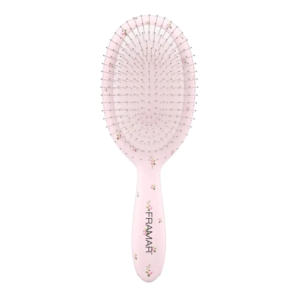 Framar Rosalie Detangle Brush blends vintage rose charm with everyday salon performance. Soft pink florals on the outside, flexible bristles underneath that glide through knots without the pull and protest.